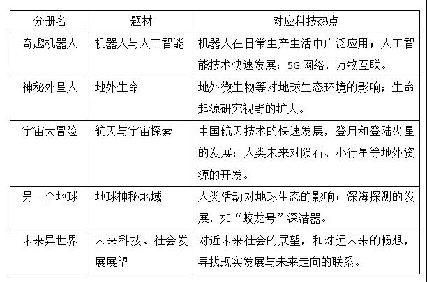 在题材选择方面,五个分册各自围绕一个主题进行编写,这五大主题囊括了80%以上的科幻文学作品题材,涉及航天、人工智能等当代尖端性、前沿性或者与未来社会发展趋势密切相关的领域。通过这五大主题的精心选择,我们力图让少年儿童读者比较全面地了解前沿科技知识发展的现状及未来趋势,培养对科学的亲近感、好奇心,以及用科学的方法、手段解决问题的思维与能力。