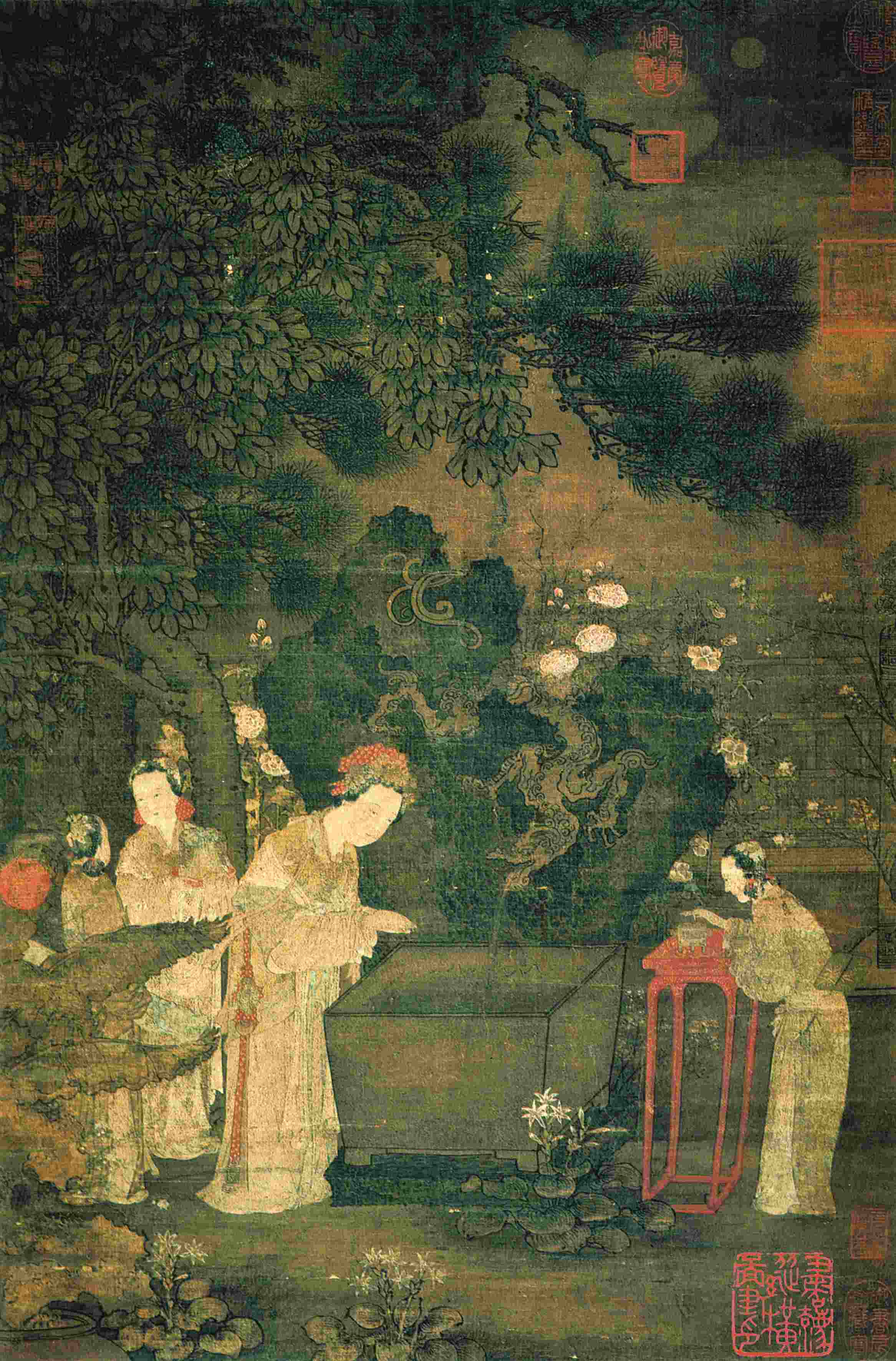 俺的《浣月图》虽然旧标为《五代人浣月图》,但是好多人都不相信俺是五代的,说俺是后世托名之作。不管怎么说,俺深信留下作品比留下名字更重要,这幅画还是很让各位大开眼界吧:明月皎洁,高悬天际,在这幽深的大家庭院里,植物茂盛,花草芳香;盘龙踞于奇石之上,低伏向下,如同自天上而来;一线清泉喷泻而出,池中波纹荡漾,明月在水,女子们对池而望,焚香祈月……俺这喷水装置有没有点“黑科技”的意思?这种赏月拜月过中秋的玩法,是不是有点人间仙境的感觉呢?