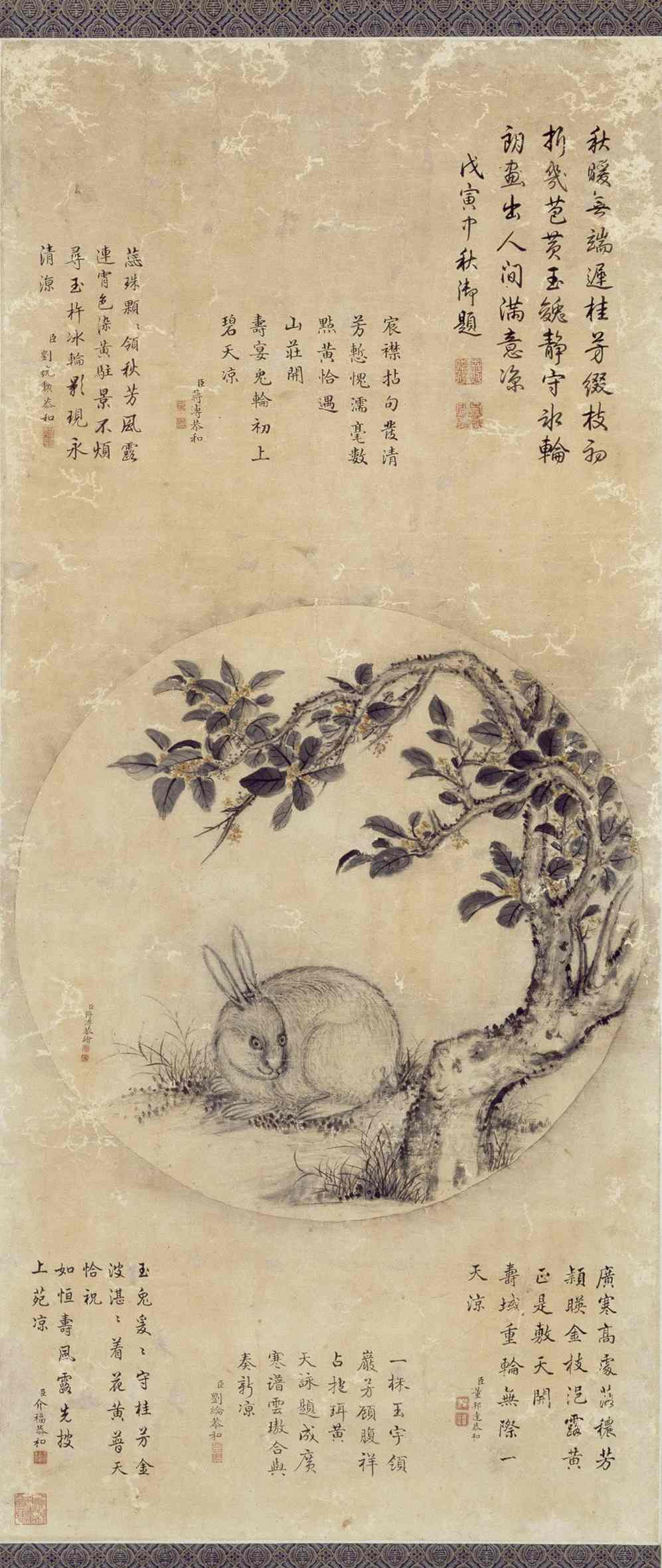那年中秋假期,欣逢陛下盛大寿宴,老夫提笔作画,现场为皇上画就《月中桂兔图》。我们君臣相遇,真乃老夫一生之大幸。皇上(乾隆帝)乘兴在画上题诗一首:“秋暖无端迟桂芳,缀枝初折几苞黄。玉㕙静守冰轮朗,画出人间满意凉。”我随之和诗一首:“宸襟拈句发清芳,惭愧濡毫数点黄。恰遇山庄开寿宴,兔轮初上碧天凉。”在场的同僚们乘月色清明,兴之所至,纷纷和起诗来。刘统勋和诗曰:“蕊珠颗颗领秋芳,风露连宵色染黄。驻景不烦寻玉杵,冰轮影现永清凉。”董邦达和诗曰:“广寒高处落秾芳,颖暎金枝浥露黄。正是敷天开寿域,重轮无际一天凉。”刘纶和诗曰:“一株玉宇领巌芳,顾腹祥占抱珥黄。天咏题成广寒谱,云璈合与奏新凉。”介福和诗曰:“玉兔爰爰守桂芳,金波湛湛着花黄。普天恰祝如恒寿,风露先披上苑凉。”