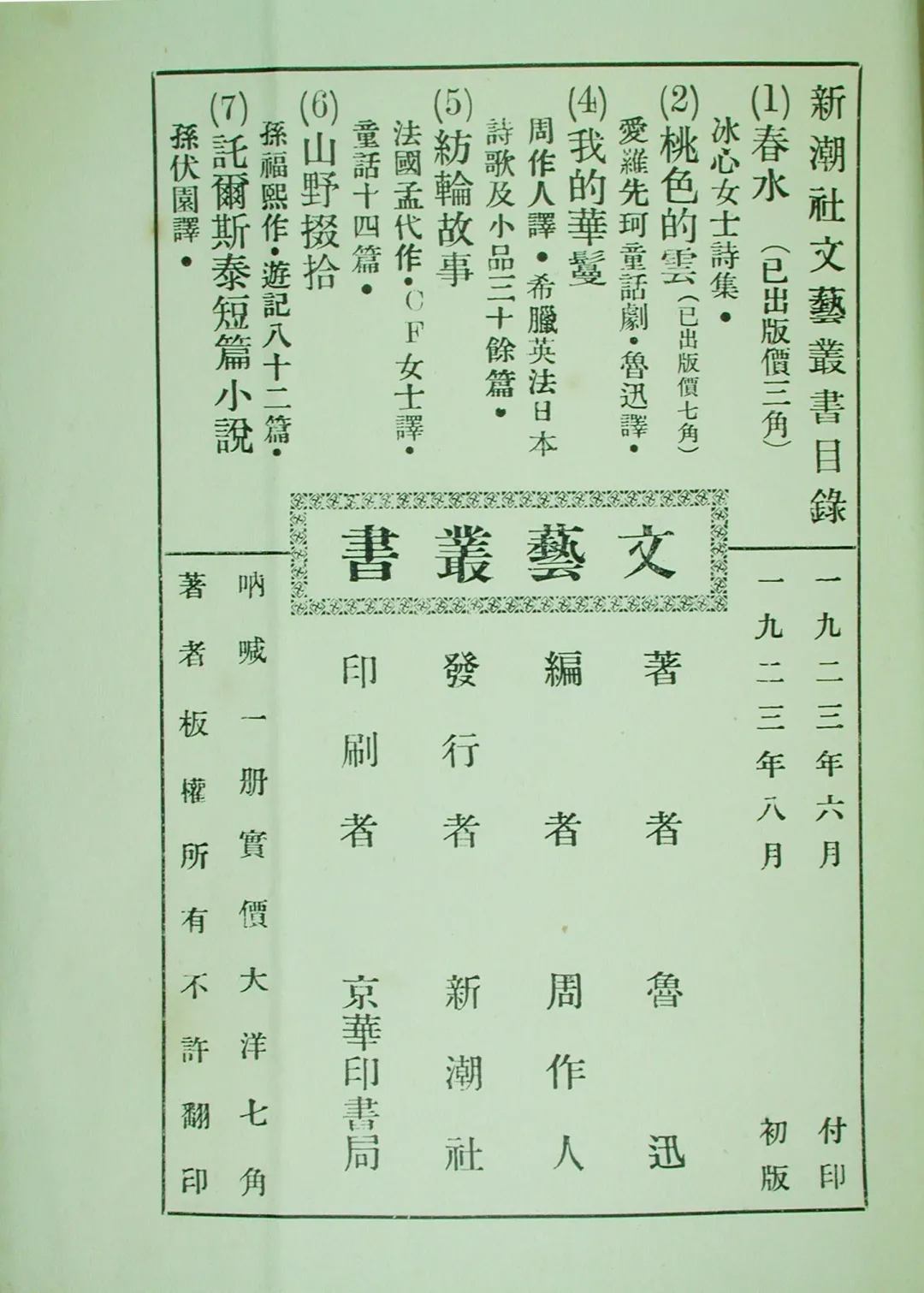 时间转眼到了1923年初,鲁迅已在报刊上发表了10多篇小说,此时在北大新潮社任主任编辑的周作人与鲁迅商量,新潮社出版的《新潮》杂志与《新潮丛书》(社科类)销路不大好,目前的经费捉襟见肘,难以再维系下去。根据当下文学热的形势,不如转到文学丛书方面,这样可打开销路。兄弟俩取得了一致的意见,开始运作编辑起《文艺丛书》(后改为《新潮社文艺丛书》)来,5月出版丛书第一种是冰心的诗集《春水》,7月出版第二种是鲁迅翻译爱罗先珂的童话剧《桃色的云》,8月出版第三种就是鲁迅的第一部小说集《呐喊》,集中共收了鲁迅亲自编定的15篇小说,通红封面黑方块白字也是鲁迅设计的,这种红黑色醒目的搭配,在当时是很现代的。初版由京华印书局印了2000册,为出《呐喊》鲁迅垫付了200元印费。《呐喊》受到读者热烈的追捧,不出三个月就售完了, 12月再版印了2500册,此后到1936年鲁迅去世时又再版了20多次。后来的再版本与初版本不同之处是封面黑方块中“呐喊 鲁迅”的字体由原来的铅字印刷体改为鲁迅手写美术体了,集中被鲁迅抽去了一篇《不周山》变成14篇了。90年过去了,《呐喊》依然闪烁着它那耀眼的光辉。