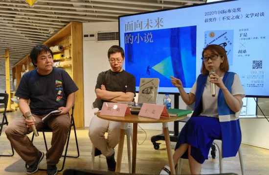 9月25日,《不安之夜》译者、作家于是(右),诗人、译者胡桑(中)做客上海幸福集荟,就《不安之夜》展开一场名为“面向未来的小说”的对谈。左为该书责编曹晴。澎湃新闻记者 罗昕 图