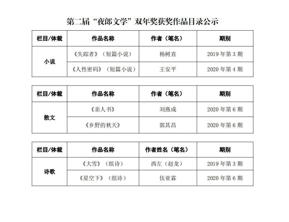 文艺创作扶持项目验收座谈会后,第二届“夜郎文学奖”颁奖典礼为6位获奖者宣读获奖词并颁发证书。获奖名单如下。