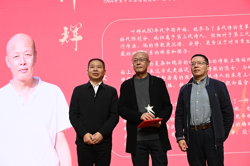 浙江省作协副主席、《江南》杂志社主编、小说家钟求是,中共永康市委常委、宣传部部长程学军为叶辉颁奖
