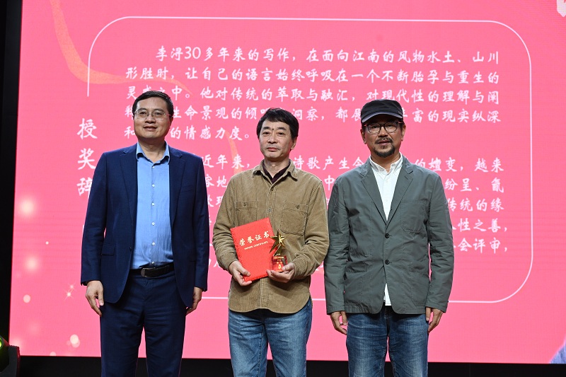 江南诗歌奖终评委、诗人、鲁迅文学奖获得者沈苇,永康市人大常委会副主任、陈亮研究会会长、诗人章锦水为李浔颁奖