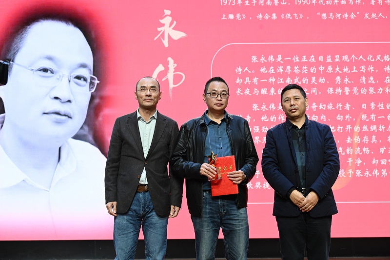 诗人、《诗潮》主编刘川,浙江省作协副主席、《江南》杂志副主编、小说家哲贵为张永伟颁奖