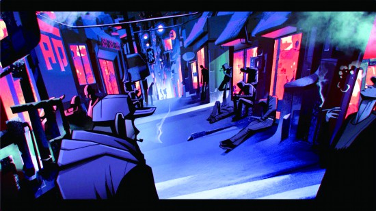 《冰》在动画设计上运用了“三渲二”的手法,即使用三维软件进行模型和场景的搭建,但最终却渲染出二维动画的效果。我们都知道,三维动画最大的优势就是对真实空间的模拟。这种模拟体现在三维软件对真实世界透视准确的捕捉,以及在视觉表现层面对真实感的渲染。不过,三维动画的“绝对逼真”已逐渐令观众和创作者产生了审美疲劳——二维动画展示的逼真性虽然达不到100%准确,却因其形式上强烈的手绘感而更加富有艺术表现力。在计算机图形学专家针对“非真实感渲染”的研究取得较大进展之后,这一将渲染风格从“拟真”转移到“风格化”的图形学技术让更多的三维动画产生了颇具表现力的渲染风格。《蜘蛛侠之平行宇宙》就是一个用“三渲二”方法渲染出风格化画面的绝佳例子。在《冰》中,为了渲染出美式漫画中粗黑边线的视觉风格,设计师为角色创建了块面分明的模型,并在模型的关键位置勾出模仿漫画的黑线。同时,影片通过大量使用广角镜头,造成了一种人物倾斜、透视不准确的错觉。笔者猜测,这一错觉的营造是为了令观众更加信服这是一部手绘动画,因为手绘的呈现效果往往带有一种不准确性。
