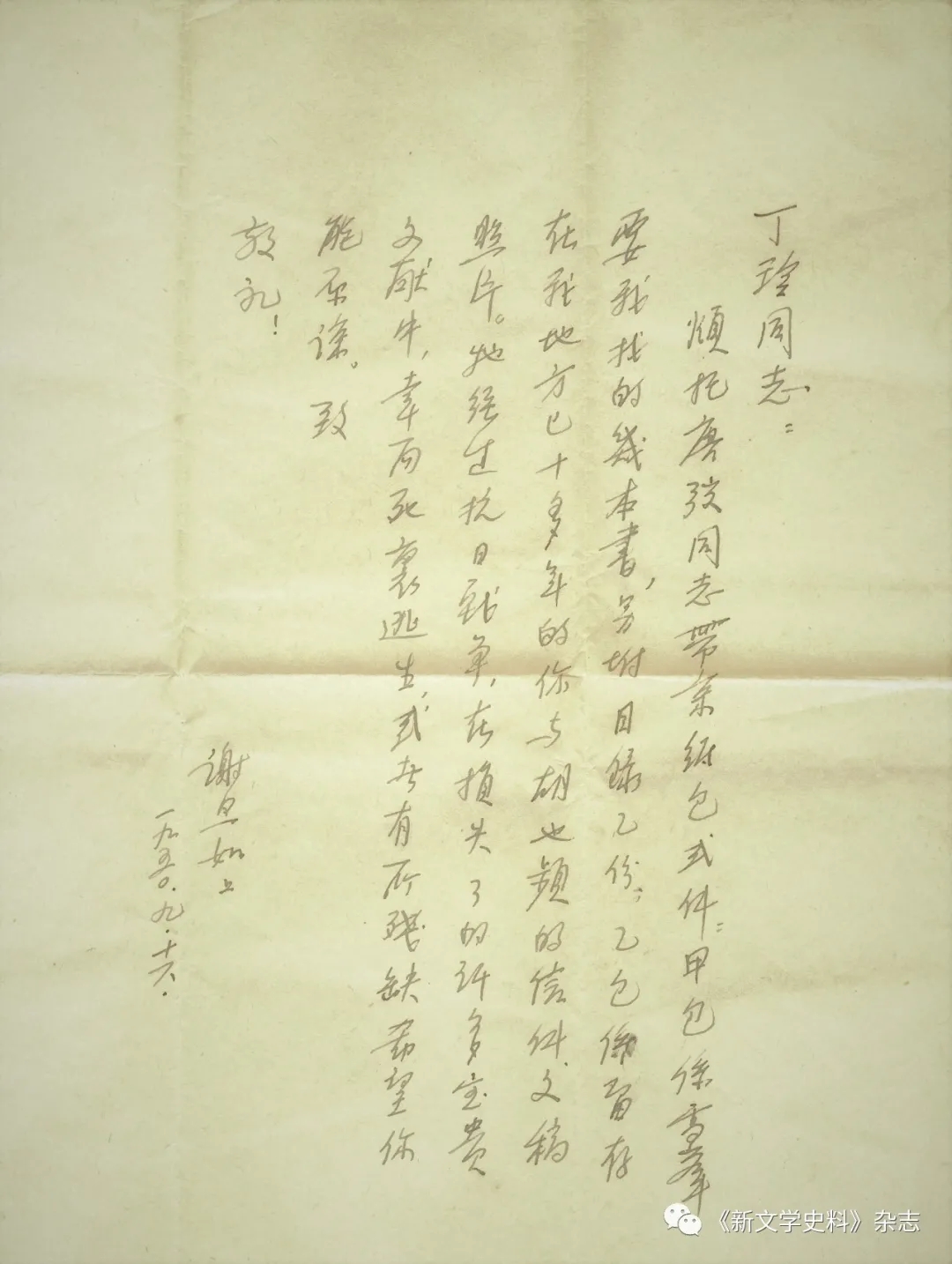 1950年,谢旦如曾经送还给丁玲一批物品,我曾见过他9月16日致丁玲信: