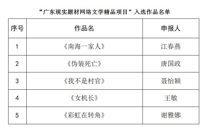 为促进广东网络文学出成果、出人才,讲好中国故事,创作富有时代特色的网络文学现实题材作品,推动网络文学创作向主流化、精品化趋势发展,广东省作家协会启动了“广东现实题材网络文学精品项目”。经公开征集、会议评审,并报请省作协党组审议通过,现已产生5部入选作品。按照公开、公平、公正的原则,现将入选作品予以公示。