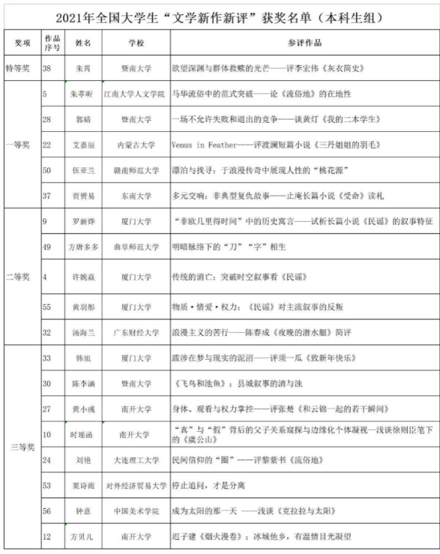参赛的评论作品涉及2020年至2021年发表出版的文学新作,既有对莫言《晚熟的人》、余华《文城》、黎紫书《流俗地》等名家新作的评论,也关注到陈春成、班宇、路内、王占黑等青年作家的新作,展示了新一代大学生多元开放的审美趣味和崭新的表达风格。