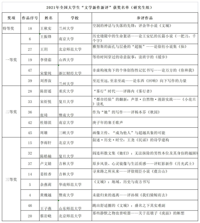 研究生组特等奖为王秋实的《空洞的神话与失落的先锋:评余华小说》,认为《文城》试图建构一个现代的“乌托邦”神话,却因过于虚置的主题意蕴与过于抽离的现实元素而没有实现其意图。文章蕴含批评的激情与锋芒,分析扎实。