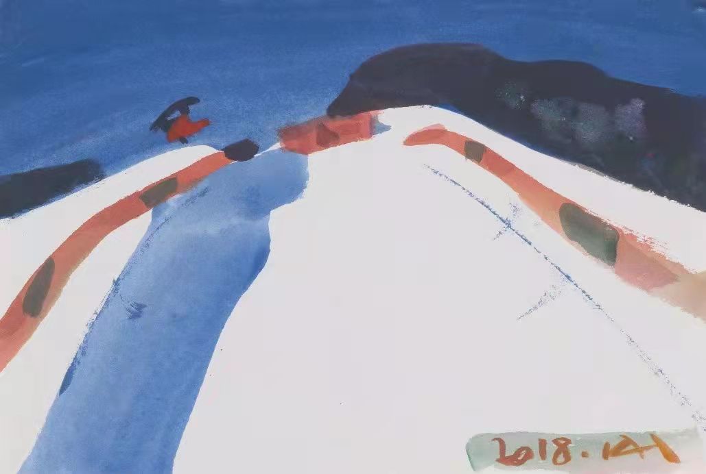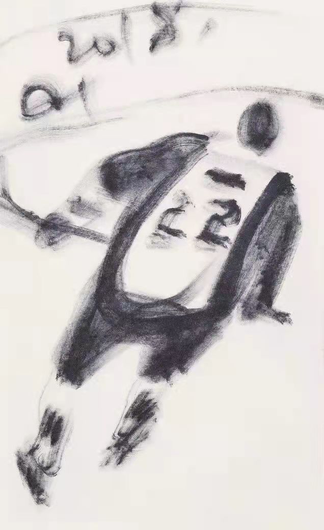 2000年以来,杨刚对着电视中的比赛场景创作了大量冬奥题材作品,用毛笔、马克笔,或签字笔、圆珠笔在各类纸上,画下了千姿百态的速写和水墨画。他喜欢速写的现场感,也强调线的趣味性,画速写成为他艺术人生的一大乐事。这些冬奥作品将速写与书法用笔、意象造型相结合,融入现代抽象与构成元素,艺术形象鲜活生动,所绘对象既有转瞬即逝的临场感与冲击力,又有雕塑般的体量感和永恒性,在寥寥数笔中实现了“速度”与“力量”的矛盾统一,体现出生命的律动和生生不息的奥运精神。