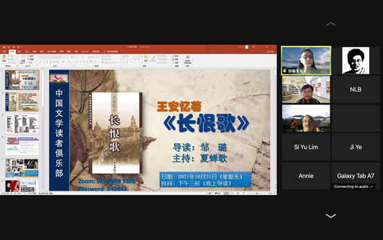 近日,新加坡“中国文学读者俱乐部”举办了中国作家王安忆《长恨歌》的线上导读会。活动由随笔南洋读书会会长王华磊主持,新加坡作家协会会员、作家邹璐导读。60多名读者线上参与了导读会,新加坡国家图书馆的网络平台进行了直播。