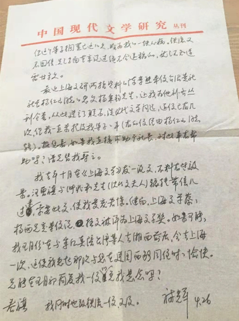 我去年十月在《上海文学》发一论文,不料有些效果。汪曾祺与张兆和先生(沈从文夫人)辗转带信儿过来,索要此文,使我受宠若惊。继而,上海文学蔡、杨两兄突来信说,拙文被评为上海文学奖。如果可能,我五月份在与季红真陪台湾某人去湘西前后,会去上海一次,这便使我想起那次与您在建国西路同住时的愉快。兄能在五月初简 复我一信以免我悬念吗?