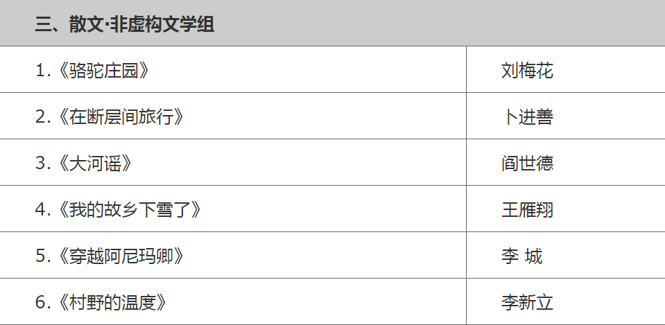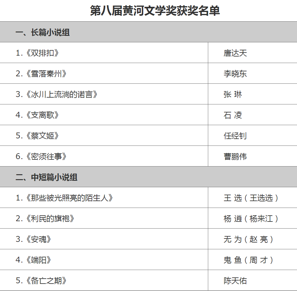 第八届甘肃黄河文学奖评奖工作于2020年12月28日启动,面向全省公开征集参评作品,共征集作品240部。经评审委员会两轮评审,产生最终获奖名单。现将获奖名单予以公示,公示期为2022年2月15日—2月23日,如有异议请于2月23日前以电话、电子邮件或信函等方式向第八届黄河文学奖评奖办公室反映。