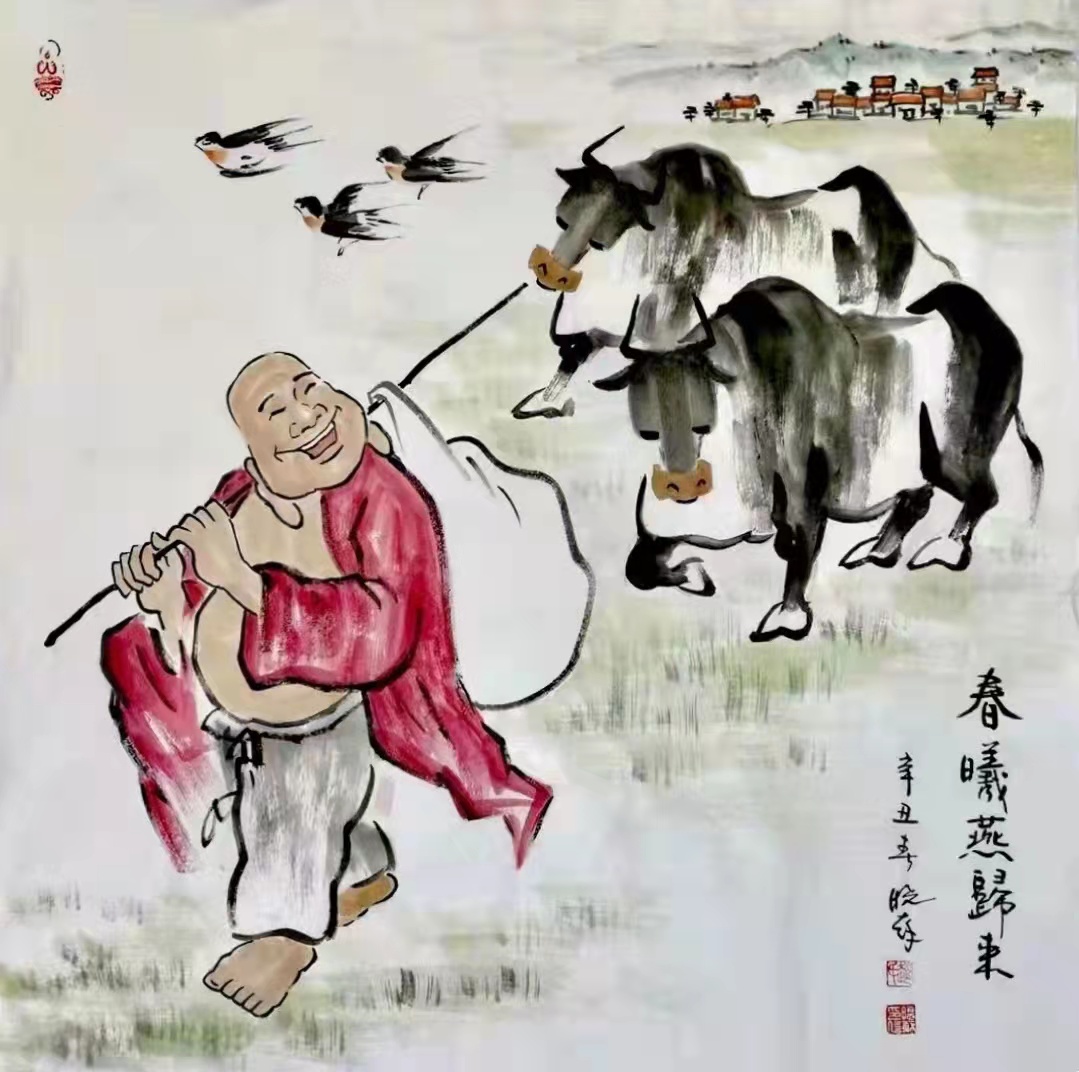 不日,赵晓苏精心构思、栩栩如生的《春曦燕归来》如约而至。但见春天的曦光里,报春燕扑闪着翅膀轻盈掠过,辛丑年蹬着蹄子欢快而来,诙谐快活的布袋和尚背着鼓鼓的布袋在前方引路。好一个禅意精深、欢天喜地的境界,喜乐祥和,满室生辉。这独具魅力的水墨禅画,给我哲理禅思和艺术享受的同时,也让我挹得天趣,心气爽然,给我带来新的生命憧憬。