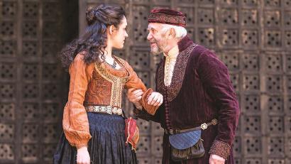 图为乔纳森·普雷斯(右)在莎士比亚环球剧院内演出《威尼斯商人》