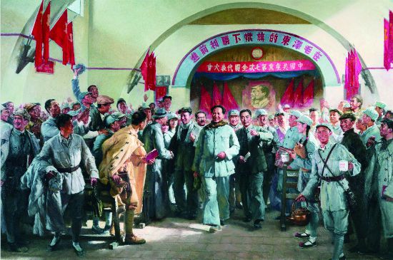 从《红潮——五四运动》《南陈北李》到《开天辟地》,从《遵义会议》《胜利会师》到《抗日烽火》,从《辽沈战役》《开国大典》到《第一部宪法》,从《第十一届三中全会》《加入世贸》到《飞天圆梦》,这些作品尺幅巨大、场景开阔、人物众多,将历史风云与人物塑造融为一体,既体现了历史画宏大叙事的造型艺术传统,也体现了多维空间组合、多种图像隐喻的当代艺术创造。历史画创作的当代价值不止于对历史真实原本的视觉再现,更在于每个时代、每个艺术家对于历史真实的发掘与重释。这些在建党百年之际创作的历史画,在视觉特征、艺术构思和人物形象塑造等方面,无不体现了新时代文化自觉的精神性与时代感。