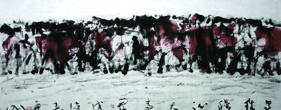生命的风景,我是从多达数十幅不同主题的草原风光中看到的。如《套马杆》(2010)、《草原的节日》(2012)、《那达慕开幕式》(2013)、《摔跤手出场》(2013)、《乌珠穆沁大马群》(2018)等。《草原的节日》寥寥数笔,一组蒙古汉子欢快地搭肩踢腿舞蹈得以呈现,看着他们,就像听到了踏着节拍的强烈节奏。《摔跤手出场》线条多了不少,摔跤手甩开的长袍、飘起的衣襟、雄健的跨步,传递出他旺盛的生命力。137*309厘米的大幅作品《乌珠穆沁大马群》中,马匹绘满了画面,既看不出马群是向人前踏行,也看不出马群是向天边飞驰,但是,就是令人感到马群的巨大生命力!或许画家正是通过模糊的、聚集的、色彩不一的马匹,传递了草原上健康的旺盛的热烈的生命。