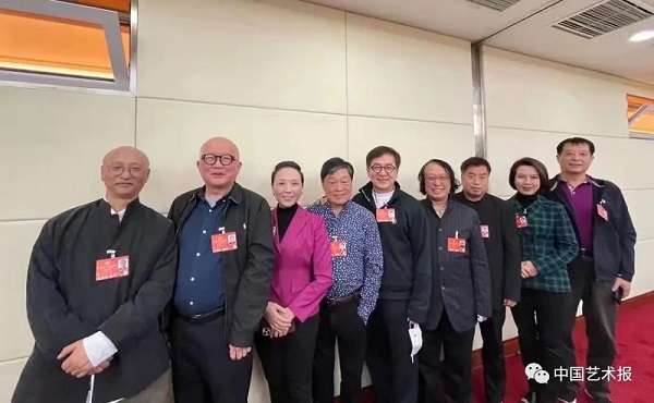 左起:全国政协委员、中国美协副主席、中国雕塑学会会长、上海美术学院院长、清华美术学院副院长曾成钢,全国政协委员、国家博物馆古代陶瓷研究所所长耿东升,全国政协委员、民进中央文化艺术专委会副主任、中国歌剧舞剧院原副院长徐丽桥,全国政协委员、湖北省文联名誉主席熊召政,全国政协委员、中国影协副主席成龙,全国政协委员、中国艺术研究院文学艺术创作院院长、中国陶瓷艺术大师朱乐耕,全国政协委员、故宫博物院研究员、原常务副院长王亚民,全国政协委员、北京京剧院青年团团长、京剧表演艺术家迟小秋,全国政协委员、北京电影学院教授侯光明