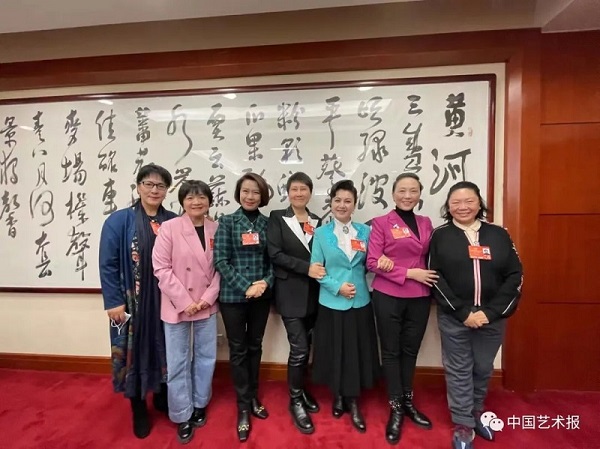 左起:全国政协委员、全国三八红旗手、云南省文联副主席宗庸卓玛,全国政协委员、中国视协副主席王丽萍,全国政协委员、北京京剧院青年团团长、京剧表演艺术家迟小秋,全国政协委员、国家话剧院一级演员张凯丽,全国政协委员、中国文联副主席、中国舞协副主席、新疆舞协主席迪丽娜尔·阿布拉,全国政协委员、民进中央文化艺术专委会副主任、中国歌剧舞剧院原副院长徐丽桥,全国政协委员、中国国家话剧院院长田沁鑫