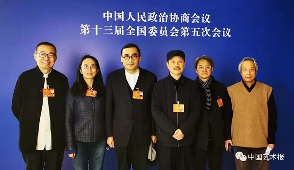 左起:全国政协委员、中国文联副主席、中国民协主席潘鲁生,全国政协委员、天津美术馆副馆长卢永琇,全国政协委员、中国艺术研究院国画院副院长、中国国家博物馆副馆长刘万鸣,全国政协委员、中国艺术研究院国画院名誉院长田黎明,全国政协委员、北京画院院长吴洪亮,全国政协委员、中国艺术研究院国画院院长牛克诚