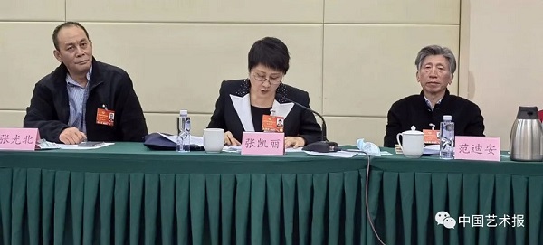 全国政协委员、中国电影表演学会秘书长张光北(左),全国政协委员、国家话剧院一级演员张凯丽,全国政协委员、中央美术学院院长、中国美协主席范迪安(右)