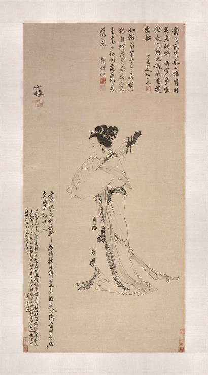 两位画家笔下的女子都不能算是写实。扬之水老师教给我:明代女子多戴发罩,高髻并不常见,这样的发型大体出自晚期画家对于早期古代女性形象的模式化创造。但郭诩所画的那一位,衣纹中有一些似是而非的“团窠花”模样,近于唐风而远于明式。尽管那所谓的唐韵,也是想象多而实据少。这么看来,吴伟草草留白,是因为他不需要暗示画中人出自哪朝哪代;而郭诩添笔之际,心中或有个模糊的意图,要让人相信“她”从唐朝走来。