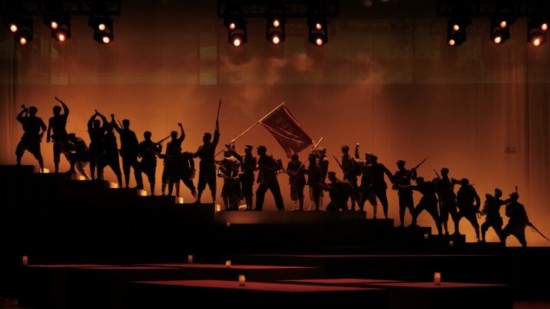 话剧舞台设计以形似摩尔斯密码的白色模块群构成,它既是通讯兵的战场,也是战士们艰难驻守的白马山,舞台置景与人物表演都充分显示出写实写意的融合。迷雾缭绕、硝烟四起的舞台在光影之间旋转流动,将三团官兵与日伪激烈交战、我方深陷险境表现尽出。这一舞台设计理念不拘泥于现实主义的写实感,而带有浓厚的象征主义色彩。再如腿摔伤的李安本站在两根竹竿之间,即模拟了人物坐在滑竿上被抬上山的感觉,又带有传统戏曲的写意特色;剧中牺牲的英雄们以独白方式在舞台上倾诉心声、讲述各自的生命前史,则有着强烈的表现主义意味。不拘泥于写实局限的舞台表现手段,应该说大大丰富了作品的精神意蕴与美学风格。