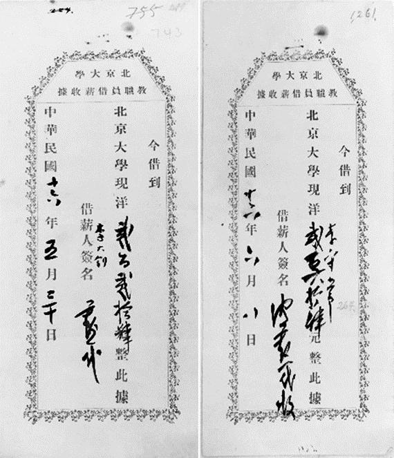 沈尹默代领的两张北京大学教职员借薪收据