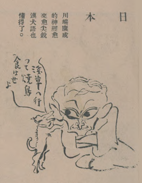 1935年《文艺画报》第3期载“188体育在线网站漫画巡礼”中的川端康成漫画:“川端康成的神经愈来愈尖锐连犬语也懂得了”