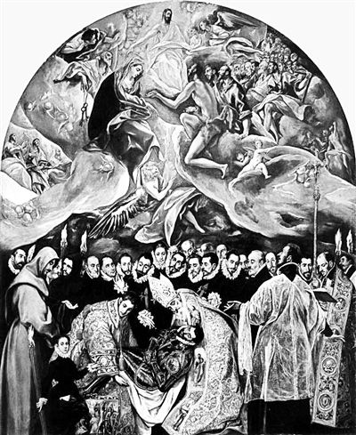 在西班牙小城托莱多,有一个中世纪教堂,名叫圣托梅,无数游客去那里瞻仰格列柯的画作《奥尔加斯伯爵的葬礼》。这幅画描绘了两位圣徒安葬奥尔加斯伯爵的一幕。画面上部天堂,下部尘世。遗体降下地面,灵魂飞升天堂。奥尔加斯伯爵是一位西班牙贵族,1323年埋葬在圣托梅教堂,在1580年代,教区牧师委托画家格列柯来描绘伯爵的葬礼和围绕它而产生的传说。据说奥尔加斯伯爵下葬时,圣奥古斯丁和圣斯蒂芬从天上出现,帮助吊唁者埋葬他。