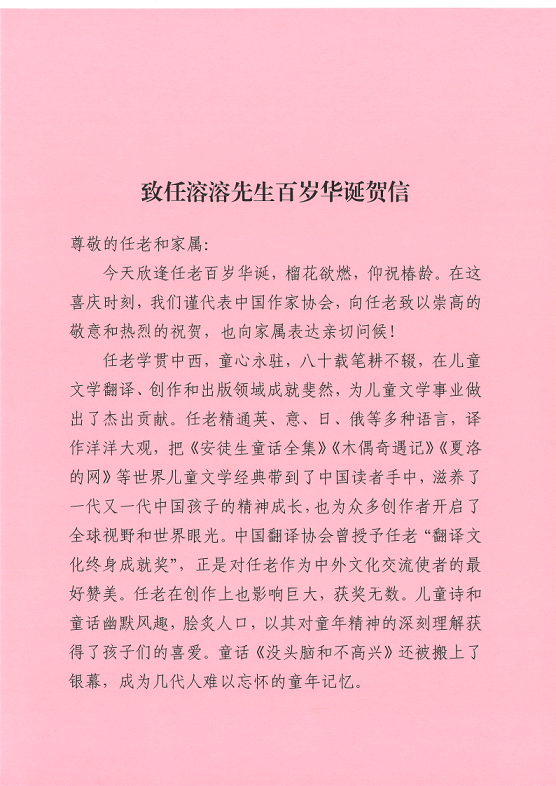 中国作协贺信中写道,任老学贯中西,童心永驻,八十载笔耕不辍,在儿童文学翻译、创作和出版领域成就斐然,为儿童文学事业做出了杰出贡献。他把世界儿童文学经典带到了中国读者手中,滋养了一代又一代中国孩子的精神成长,也为众多创作者开启了全球视野和世界眼光。任老在创作上也影响巨大,获奖无数。儿童诗和童话幽默风趣,脍炙人口,以其对童年精神的深刻理解获得了孩子们的喜爱。贺信中说:“任老爱孩子,爱生活,爱文学,生性豁达乐观,把为孩子写作看作一生最快乐最愿意去做的事。作为儿童文学泰斗的百岁任老至今仍在写作,以令人敬仰的人格风范和永不改变的写作初心,继续照亮新时代中国儿童文学的前行之路。……把最美好的祝福送给任老,祝您身健笔健,福寿绵长!”