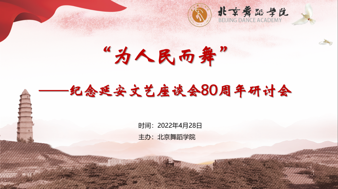 在延安文艺座谈会召开80周年,习近平总书记在文艺座谈会讲话8周年之际,为致敬经典,因应时代,北京舞蹈学院于4月28日通过线上线下相结合的方式召开“为人民而舞”——纪念延安文艺座谈会80周年研讨会。会议围绕“延安文艺座谈会的历史意义和当代影响”“文艺座谈会精神的一脉相承和创新发展研究”“党领导艺术教育办学经验研究”“为人民而舞的价值和实践研究”“思政教育和艺术教育融合的路径研究”等议题展开。中国文联、中国舞蹈家协会、中国东方演艺集团、北京演出行业协会、北京舞蹈学院、西安美术学院、中国戏曲学院、中国音乐学院、北京服装学院、广州美术学院、广西师范大学、云南艺术学院、吉林艺术学院等校内外专家学者、教师和学生代表1500余人云参会。