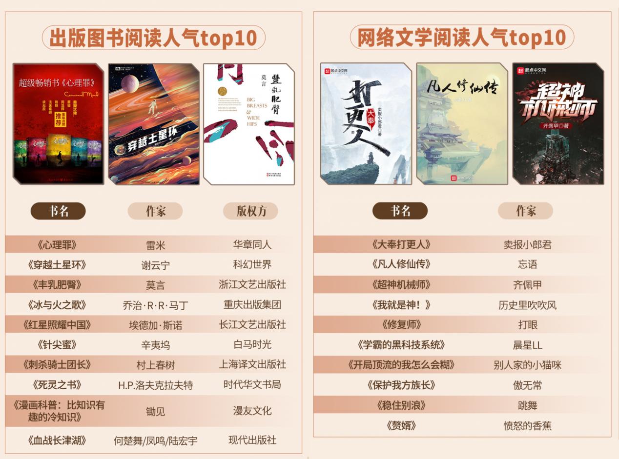 “全民阅读月”出版图书和网络文学阅读人气Top10