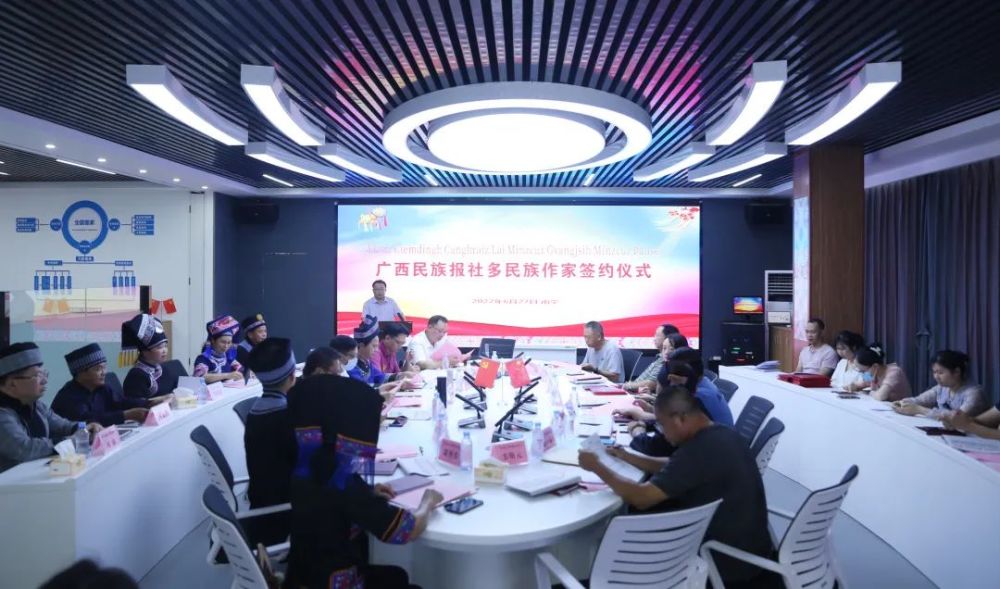 今年是《广西民族报》创刊65周年、复刊40周年,建立签约作家制度,是广西民族报社在推动多民族文学创作发展、服务铸牢中华民族共同体意识建设方面的创新举措和有益尝试。“报社将认真总结签约作家工作实践,进一步健全制度机制,加大扶持力度,深化‘岜莱诗会’‘民族作家’和‘ 中华民族共同体建设’之理论版、故事版、交流版、文旅版等栏目和版块,搭建载体平台,努力把签约作家制度的实施转化为实实在在的创作成果,推动签约作家工作走深走实,涌现出更多的精品佳作,以优异的成绩迎接党的二十大胜利召开。”报社与会领导如是说。(图 /黄云)