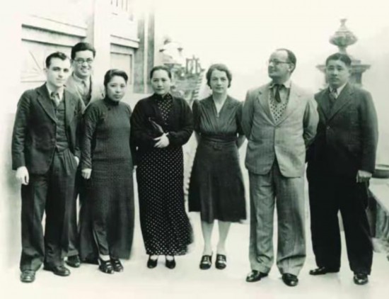 宋庆龄为抗日募款宣传而组织“保卫中国同盟”。从左到右分别是爱泼斯坦、香港《华商报》创办人邓文钊、廖仲恺之女廖梦醒、宋庆龄、司徒永觉的夫人希尔达·塞尔温-克拉克(Hilda Selwyn-Clarke)、我们的主人公佛朗士和廖仲恺之子廖承志,摄于1938年。香港大学档案馆藏。