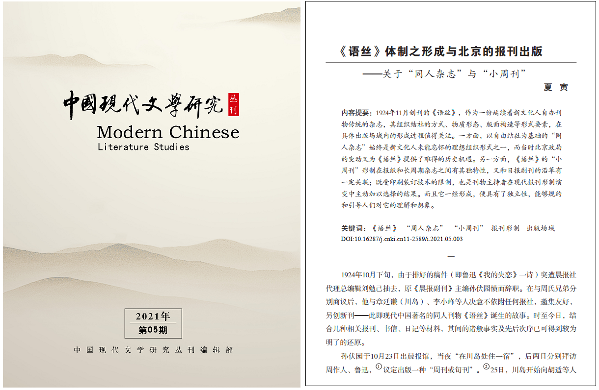 经过《丛刊》执行编委、责任编辑的推荐和评委的投票,共有7篇论文获得《丛刊》2021年度论文奖,其中苏心、夏寅获得“博士生奖”。北京大学中文系在读博士夏寅凭借《〈语丝〉体制之形成与北京的报刊出版——关于“同人杂志”与“小周刊”》(《丛刊》2021年第5期)一文获奖,在接受中国作家网采访时他表示,获奖极为惊喜、深感鼓舞,希望未来能继续对现代文学的生产方式及其文献学特点等问题一探究竟。