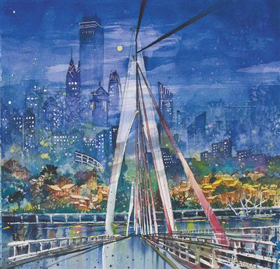 无论城市如何变迁,河流都是其重要组成部分。纵横交错的水系,不仅赋予城市蓬勃活力,也滋养着画家的创作。孙灵的四联版画《希冀之河》便以城市河流为主题,通过多场景、多视角的切换,呈现苏州河经过治理后的新面貌。画作中,蜿蜒的碧水与现代城市景观相融共生,尽显城市生态的和谐之美。姚思敏中国画《锦江秋色》的诞生,则源于画家在城市生活中的切身体验。当看到飞翔的鹭鸶掠过秀美的江水,金黄银杏与青瓦朱楹相映生辉,画家忍不住提起画笔,以长卷记录下这动人的景象。淋漓的水墨使现代都市多了一抹朦胧韵致。