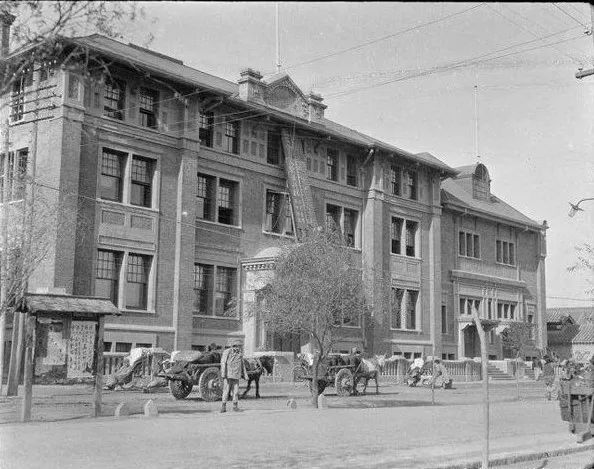 前面已经提及,1918年至1919年间,甘博任北京某青年会干事,自然是经常出入位于东单北大街的北京基督教青年会大楼(1988年拆除)。这是一座红砖砌筑的3层楼(外加半地下室),占地面积360平方米,1911年4月开建,1913年7月竣工,在当年属于北京城里豪华的西洋建筑。甘博《北京的社会调查》第十六章有一节专门介绍其开展的七项工作,排在第一位的是:“在大楼内开展或提供的社会和教育活动——音乐会、电影、演讲、游泳池、台球、餐馆、阅览室、图书馆和宿舍。”书中插图乃此大楼清晰的正面照(图2),正可作为上述四帧连续照片的背景资料。