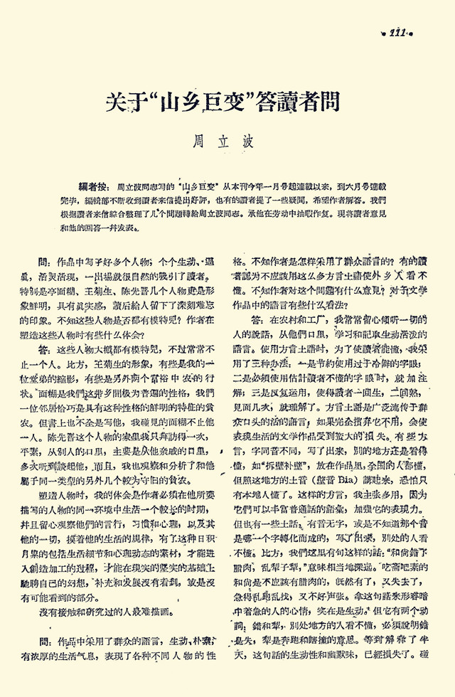 著名作家周立波代表作长篇小说《山乡巨变》在《人民文学》1958年1至6月号连载推出,引发了广泛的关注和热烈的讨论。六个月内,编辑部不断收到读者来信,给出好评,也有部分读者提出了一些相关的疑问,希望作者解答。《人民文学》编辑部根据读者来信,综合整理了几个问题转给周立波,并在当年7月号刊出《关于“山乡巨变”答读者问》一文,将读者意见与作家的回答一并发表。