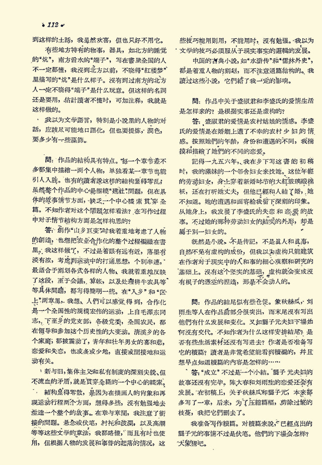 问:作品中采用了群众的语言,生动、朴素,有浓厚的生活气息,表现了各种不同人物的性格。不知作者是怎样采用了群众语言的?有的读者认为不应该用这么多方言土语使外乡人看不懂。不知作者对这个问题有什么意见?对于文学作品中的语言有些什么看法?
