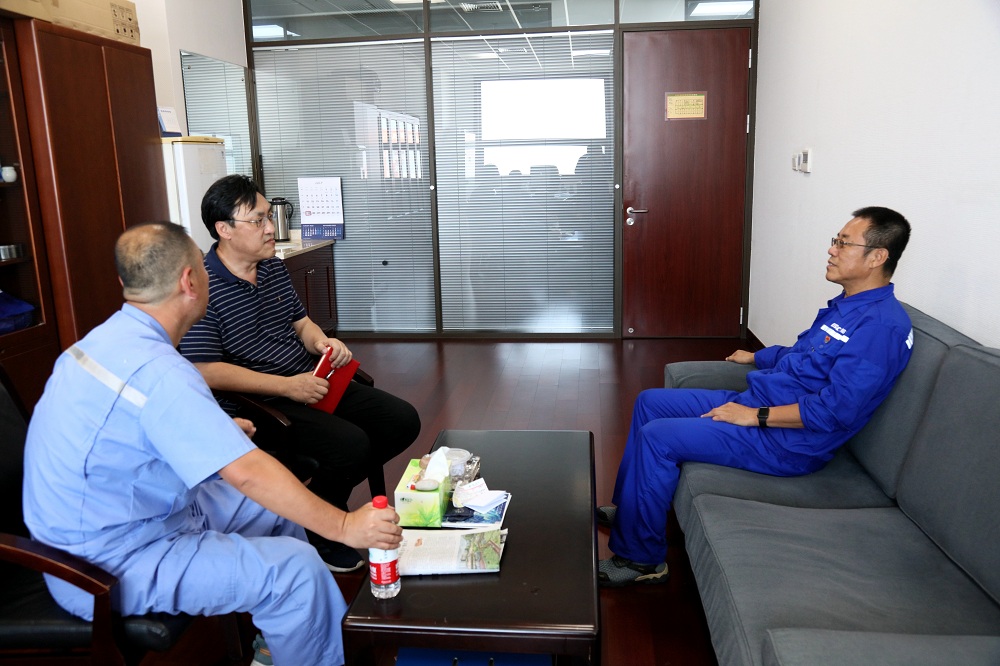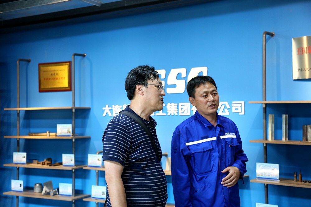 2022年7月25日下午,作家于永铎采访大连船舶重工集团副总工程师姜福茂,了解了大连船舶重工集团始终以科技为本,组织科研人员努力攻关诸如节能减排、无人驾驶等未来概念型船舶设计难题,引领国内船舶制造行业走向辉煌。图为采访现场。