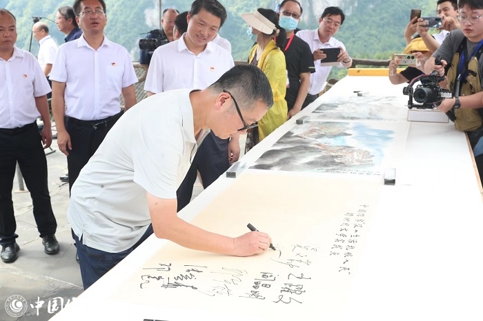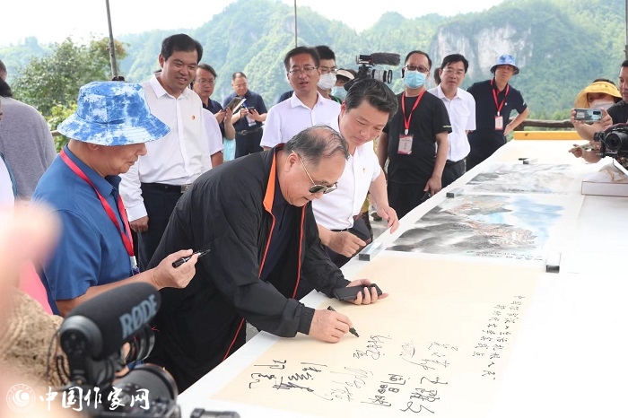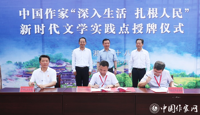 中国作协主席团委员、书记处书记邱华栋为中国作家“深入生活、扎根人民”新时代文学实践点授牌,湘西州州委书记虢正贵接牌