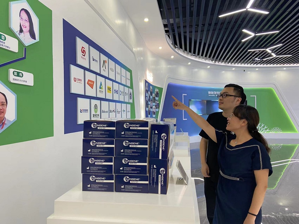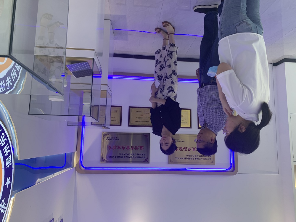 2022年7月25日,作家曹凌云(中)在中电海康•温州光电产业创新联合体参观各类产品。
