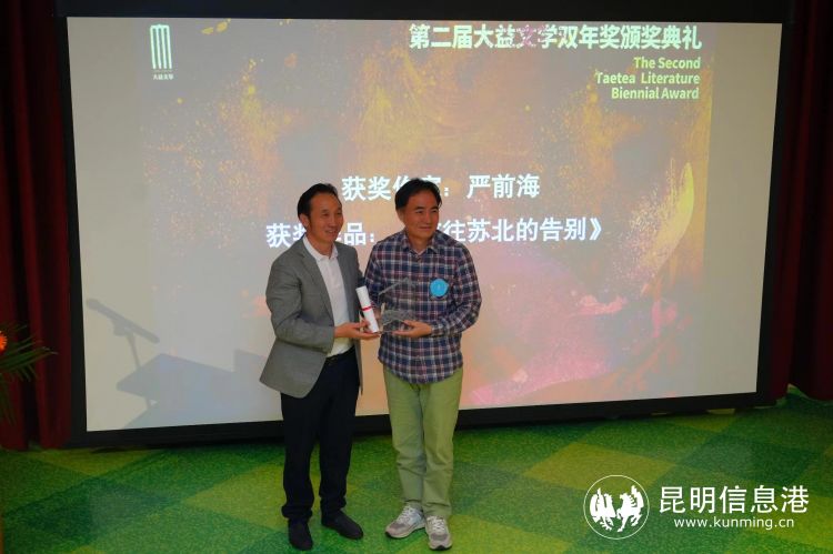 8月1日,第二届"大益文学双年奖"颁奖典礼在昆明璞玉书店举办。由著名作家马原,著名评论家陈晓明,著名出版人彭伦、曹元勇,大益文学院院长陈鹏5位终审评委从大益文学书系13辑——20辑(两年,8辑)的十位入围作家中最终评选出一位获奖作家。最终,严前海凭借《前往苏北的告别》从十位入围作家中脱颖而出,获得第二届"大益文学双年奖"。