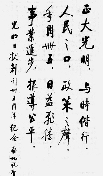 1994年,启功先生作诗并写书法庆贺光明日报创刊45周年:“正大光明,与时偕行。人民之口,政策之声。年周卌五,日益飞腾。事业进步,报道公平。”