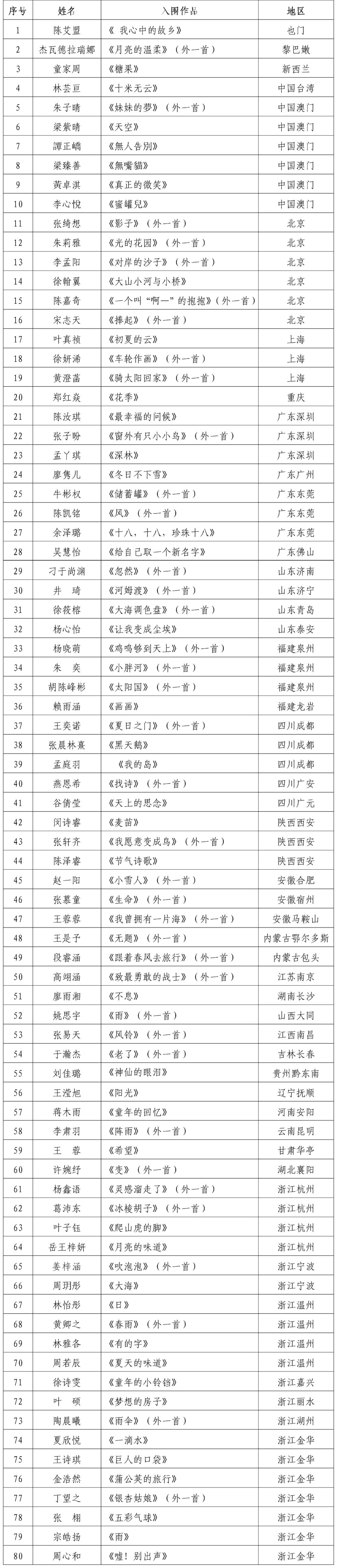 由中国作家协会儿童文学委员会、浙江省作家协会、义乌市人民政府主办,中国校园文学杂志社学术指导的第三届义乌骆宾王国际儿童诗歌大赛共收到来自45个国家和地区的投稿作品22056件。所有参赛作品以匿名方式采取筛选、初评、复评等程序,经过中国作家协会原副主席、儿童文学委员会主任、著名儿童文学作家高洪波,中国作家协会儿童文学委员会副主任、浙江省作家协会副主席、浙江师范大学教授方卫平,鲁迅文学院副院长、著名儿童文学作家、评论家李东华,上海师范大学教授、著名儿童文学作家萧萍,中国儿童文学研究会副秘书长冯臻等5名专家组成的大赛评委会评审,产生第三届义乌骆宾王国际儿童诗歌大赛成人组大奖2名、提名奖8名,青少年组入围80名。现将名单公布如下: