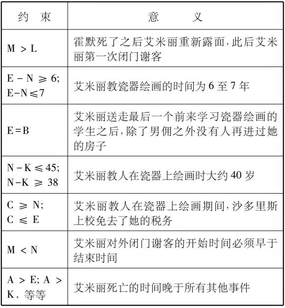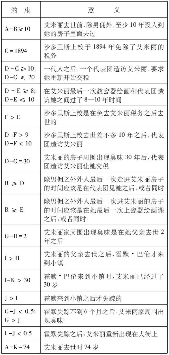 在此基础上,她们决定采用约束编程方法给《玫瑰》编辑一个程序。《玫瑰》中的事件大多只有一些模糊的相对时间信息,新的电脑程序通过对这些信息加以整理,给所有变量附加一些约束,将最大限度地整理出不同变量之间的准确时间关系。例如,由于艾米丽获得税务豁免的时间是1894年,所以可以用C=1894来表示,同样,由于艾米丽死前的10年当中除了黑人男佣之外谁也没有进过她家的房子,所以可以用A-B≥10来表示。通过这样的等式和不等式,我们就可以得出一个新的表格:
