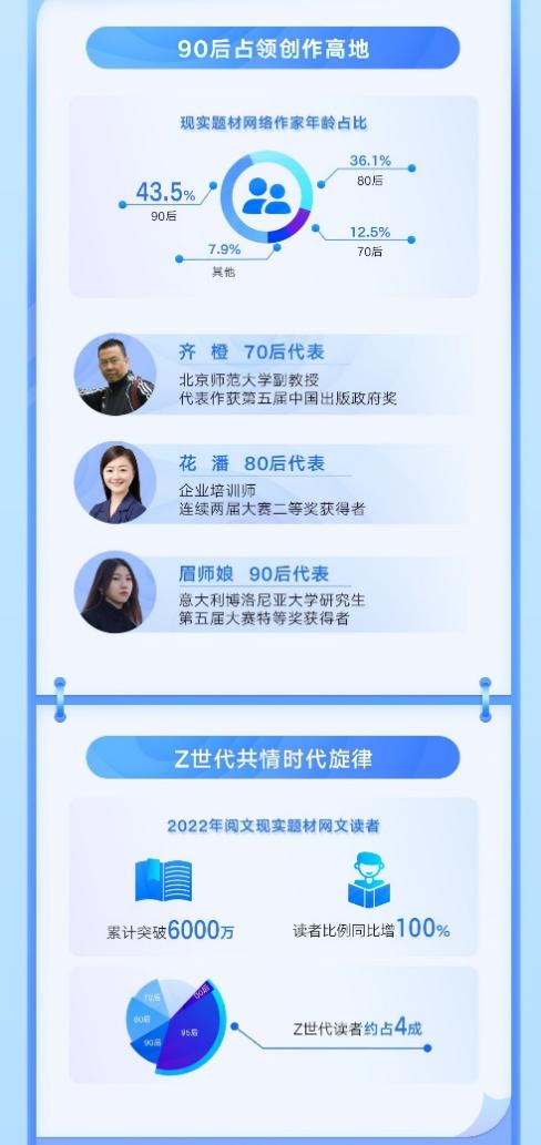 《报告》显示,现实题材年轻化趋势显著。90后创作者成长为中坚力量,占比达43.5%,本届大赛优胜奖获得者“时不识路”(1992年)、第五届大赛特等奖获得者“眉师娘”(1998年)等是其中的佼佼者。与创作队伍的年轻化相呼应,在累计6000万名读者中,Z世代占比约4成。