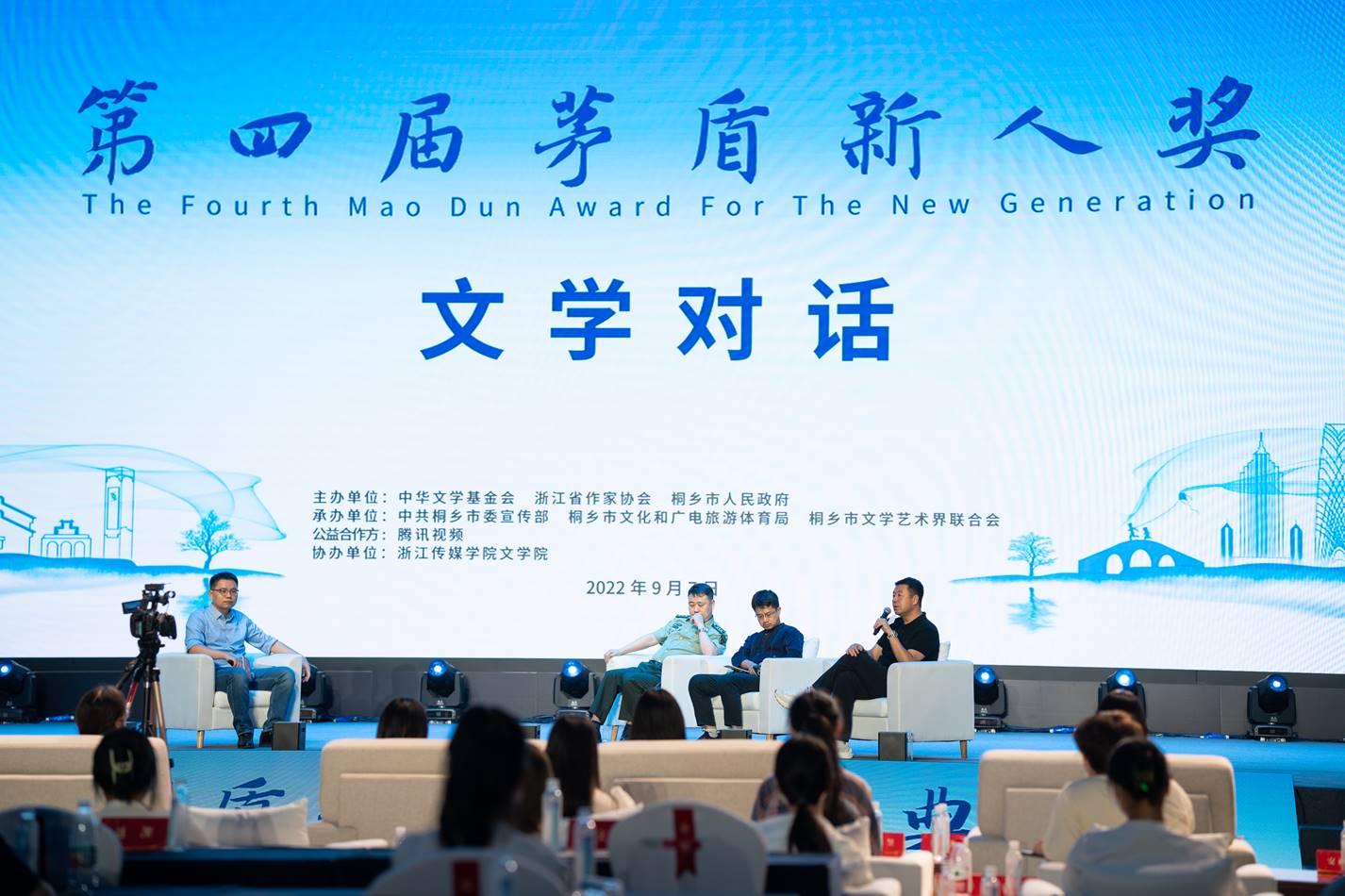 9月7日下午,由中华文学基金会、浙江省作家协会和桐乡市人民政府共同主办的第四届茅盾新人奖颁奖典礼在浙江桐乡举行。中国作家协会党组成员、副主席、书记处书记陈彦,中国作家协会副主席、中华文学基金会理事长徐贵祥,浙江省作家协会党组书记、副主席臧军出席颁奖典礼并致辞,中共桐乡市委书记于会游致欢迎辞。中华文学基金会副理事长、秘书长鲍坚,中华文学基金会副秘书长安亚斌,浙江省作家协会党组副书记、二级巡视员曹启文,中共桐乡市委常委、宣传部部长俞奕凌,桐乡市人大常委会副主任徐建东,腾讯视频文学总监王聪,以及白烨、叶延滨、夏烈、马季、桫椤等评委,第三届茅盾新人奖获奖者叶炜、房伟等参加颁奖典礼并为获奖者颁奖。